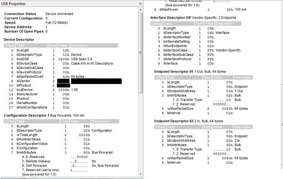 下面是在PC上正确枚举的USB属性。我与设备制造商进行了沟通,后者证实了一家外部公司认证该设备符合USB2.0规范。最初,我怀疑该设备被Android拒绝,因为它忽略了以下字段: iManufacturer、iProduct和iSerialNumber,这些都是其他兼容设备所包含的。但是,在回顾了USB2.0规范第9.5节的摘录后,这些字段似乎是不必要的