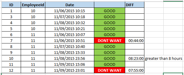 我需要的是按员工分组,但我必须排除同一天的时间戳,两者之间的差异是小于8小时。