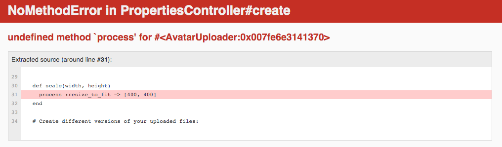 我有一个简单的模型,安装了一个载波上传器。RubyVersion2.2.3,Rails 4.2.4,Imagemagick安装在mac (10.11.1 El Capitan)上。安装了MiniMagick 4.3.6GEM;但是,我得到了用于上传器的错误未定义方法进程。