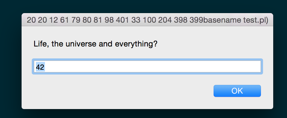 my $result = dialog("Life, the universe and everything?", "42");