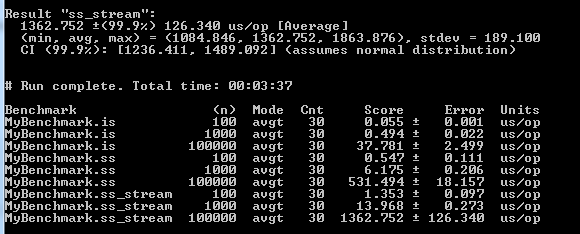 因此,我在几个方法上运行了JMH基准测试,得到了如下响应: