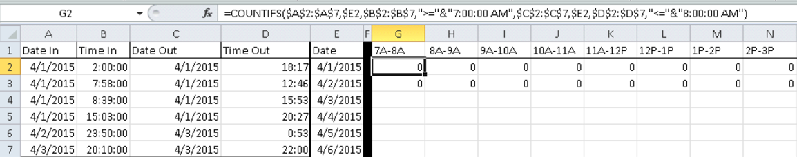 =CountTimeSlots($A$2:$A$7,$B$2:$B$7,$C$2:$C$7,$D$2:$D$7,$E2,G$1)(第4步)我建议您交换E列和F列,或者删除列F。乍一看,E列中的日期与and列是分开的,这并不是很直观。