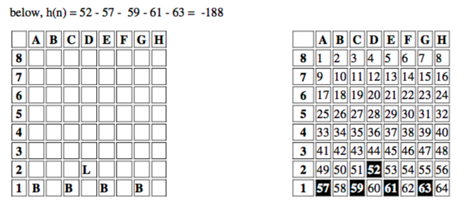 有一个简单的方法可以大大提高你的启发式。在当前的启发式中,平方A1的值比平方A8的值少8。这使得鸟类倾向于向左边的游戏板移动,因为向左的移动总是比向右的移动要高。这是很准确的。第1行上的所有方格都应该具有相同的值。这样,在第1a1行,第2a2行,等等,所有的正方形都会被分配。这样,鸟类和幼虫就不会倾向于向左移动,而是可以专注于做出一个好的移动。