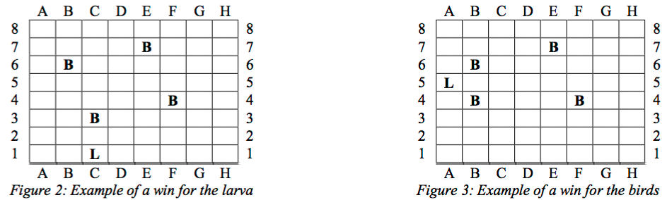 当游戏开始时,幼虫开始,然后一只鸟可以移动(任何一只),然后是幼虫,等等。