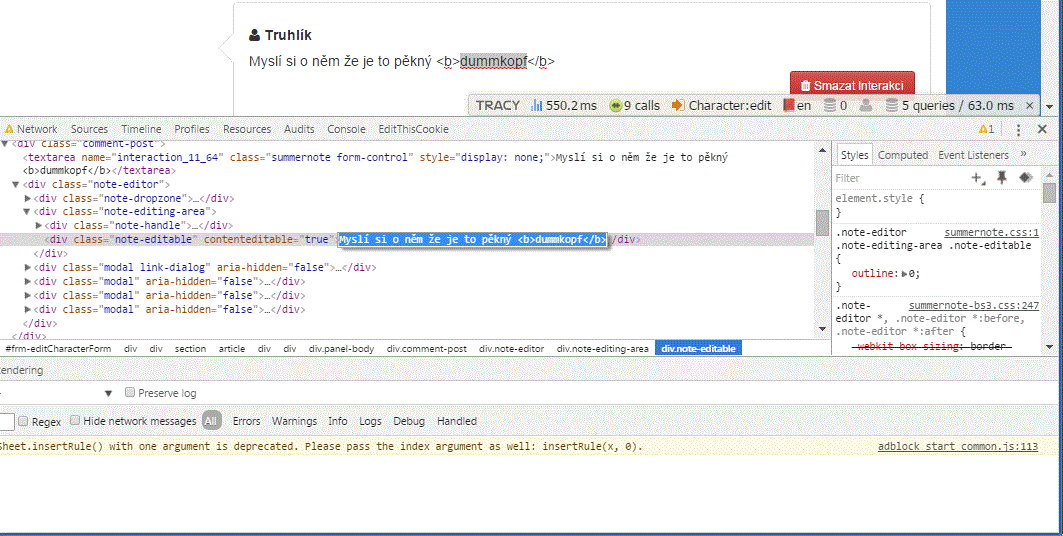 我使用的是名为summernote的wysiwyg,它是我发送给服务器的值,在那里我使用HTML净化器来净化它。之后,我将其保存到DB (mysql)中。然后,我需要将纯化的html显示在wysiwyg中,因此将其写为textarea值( textarea在js中与summernote链接)。但它显示的是转义的html,而不是格式化的文本。编辑器正常工作,js控制台没有显示错误。