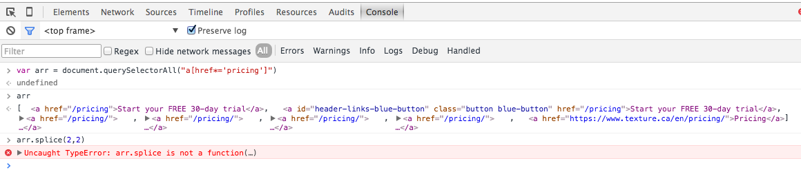 var arr = document.querySelectorAll("a[href*='somestring']")返回控制台中的数组。正方形括号[]和arr.length = 7。