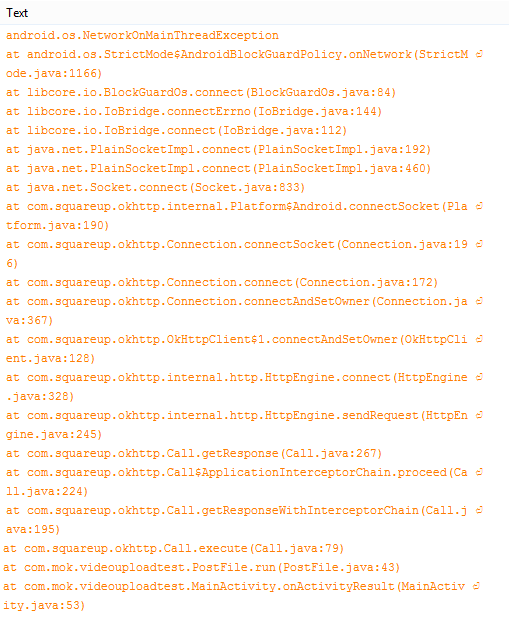 我想上传一个视频(从库中选择)到服务器(localhost-Wampserver正在我的计算机上运行Apache2.4.4)。从异常和搜索中,我发现网络操作不应该发生在运行UI的线程中。但我该怎么做呢?我的代码如下: