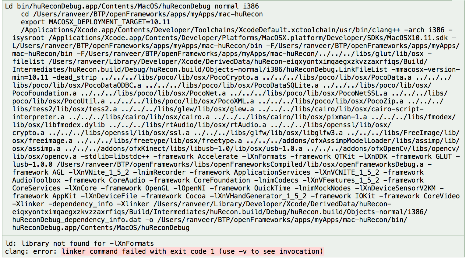 /Applications/Xcode.app/Contents/Developer/Toolchains/XcodeDefault.xctoolchain/usr/bin/clang++ -arch x86_64 -isysroot /Applications/Xcode.app/Contents/Developer/Platforms/MacOSX.platform/Developer/SDKs/MacOSX10.11.sdk -L/Users/ranveer/BTP/openFrameworks/apps/myApps/mac-huRecon/bin -F/Users/ranveer/BTP/openFrameworks/apps/myApps/mac-huRecon/bin -F/Users/ranveer/BTP/openFrameworks/apps/myApps/mac-huRecon/../../../libs/glut/lib/osx -filelist /Users/ranveer/Library/Developer/Xcode/DerivedData/huRecon-eiqxyontximqaegxzkvzzaxrfiqs/Build/Intermediates/huRecon.build/Debug/huRecon.build/Objects-normal/x86_64/huReconDebug.LinkFileList -mmacosx-version-min=10.11 -dead_strip ../../../libs/poco/lib/osx/PocoCrypto.a ../../../libs/poco/lib/osx/PocoData.a ../../../libs/poco/lib/osx/PocoDataODBC.a ../../../libs/poco/lib/osx/PocoDataSQLite.a ../../../libs/poco/lib/osx/PocoFoundation.a ../../../libs/poco/lib/osx/PocoNet.a ../../../libs/poco/lib/osx/PocoNetSSL.a ../../../libs/poco/lib/osx/PocoUtil.a ../../../libs/poco/lib/osx/PocoXML.a ../../../libs/poco/lib/osx/PocoZip.a ../../../libs/tess2/lib/osx/tess2.a ../../../libs/glew/lib/osx/glew.a ../../../libs/cairo/lib/osx/cairo-script-interpreter.a ../../../libs/cairo/lib/osx/cairo.a ../../../libs/cairo/lib/osx/pixman-1.a ../../../libs/fmodex/lib/osx/libfmodex.dylib ../../../libs/rtAudio/lib/osx/rtAudio.a ../../../libs/openssl/lib/osx/crypto.a ../../../libs/openssl/lib/osx/ssl.a ../../../libs/glfw/lib/osx/libglfw3.a ../../../libs/FreeImage/lib/osx/freeimage.a ../../../libs/freetype/lib/osx/freetype.a ../../../addons/ofxAssimpModelLoader/libs/assimp/lib/osx/assimp.a ../../../addons/ofxKinect/libs/libusb-1.0/lib/osx/usb-1.0.a ../../../addons/ofxOpenCv/libs/opencv/lib/osx/opencv.a -stdlib=libstdc++ -framework Accelerate /Users/ranveer/BTP/openFrameworks/apps/myApps/mac-huRecon/bin/data/lXnFormats.dylib -lXnFormats -framework QTKit -lXnDDK -framework GLUT -lusb-1.0.0 /Users/ranveer/BTP/openFrameworks/apps/myApps/mac-huRecon/bin/data/XnFormats.dylib /Users/ranveer/BTP/openFrameworks/libs/openFrameworksCompiled/lib/osx/openFrameworksDebug.a -framework AGL -lXnVNite_1_5_2 -lnimRecorder -framework ApplicationServices -lXnVCNITE_1_5_2 -framework AudioToolbox -framework CoreAudio -framework CoreFoundation -lnimCodecs -lXnVFeatures_1_5_2 -framework CoreServices -lXnCore -framework OpenGL -lOpenNI -framework QuickTime -lnimMockNodes -lXnDeviceSensorV2KM -framework AppKit -lXnDeviceFile -framework Cocoa -lXnVHandGenerator_1_5_2 -framework IOKit -framework CoreVideo -Xlinker -dependency_info -Xlinker /Users/ranveer/Library/Developer/Xcode/DerivedData/huRecon-eiqxyontximqaegxzkvzzaxrfiqs/Build/Intermediates/huRecon.build/Debug/huRecon.build/Objects-normal/x86_64/huReconDebug_dependency_info.dat -o /Users/ranveer/BTP/openFrameworks/apps/myApps/mac-huRecon/bin/huReconDebug.app/Contents/MacOS/huReconDebug然后,