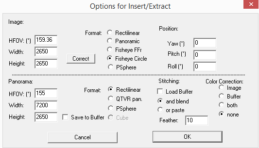 我有一个圆形鱼眼图像,想要转换成直线图像。因此,我尝试使用Hugin软件和PanoTools Photoshop插件来获得所需的投影、水平视场(HFoV)值和所需的输出宽度高度。