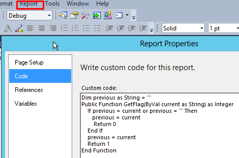 转到Report菜单/ Report Properties并选择Code选项卡。在文本框中放置以下代码: