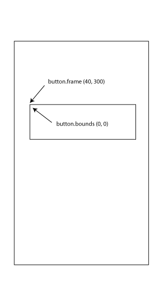 这里的诀窍是bounds和frame之间的区别。在按钮的情况下,当您查看它的superview时,它的框架就是它所在的位置(例如,42,42)。但是,边界是按钮相对于自身和自己的坐标(0,0)的位置。