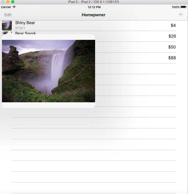 我有项目表(UITableViewController),在这里我使用可自定义的单元格表示项目。在每个单元格的左边,我有一个缩略图,当您单击它时(准确地说,在图像上方的一个按钮上),会出现一个弹出窗口,显示放大的图像。它只适用于第一个单元: