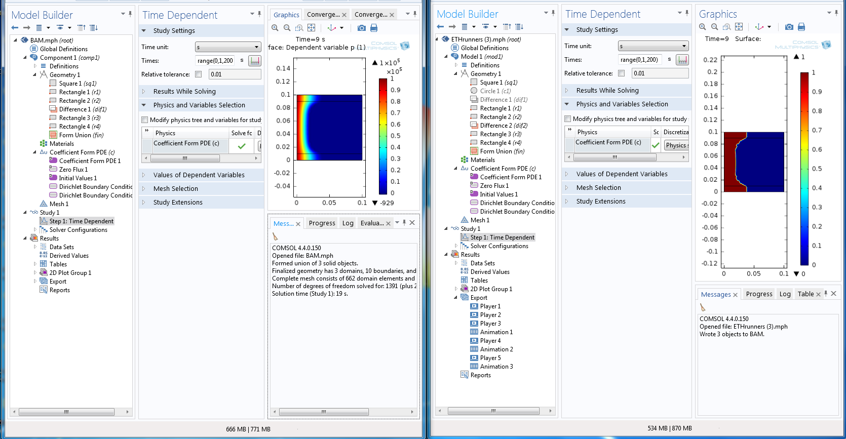 我正在使用一个示例问题来学习comsol。我想让我的案例问题(左)三维图,是相同的教程情节(右)。我的问题是,不是右边的图形(显示树脂红的颜色从左到右),我得到的是不符合的左边的。你有什么想法,如果有选择得到正确的情节,或建议,为什么我得到左的情节,而不是右?