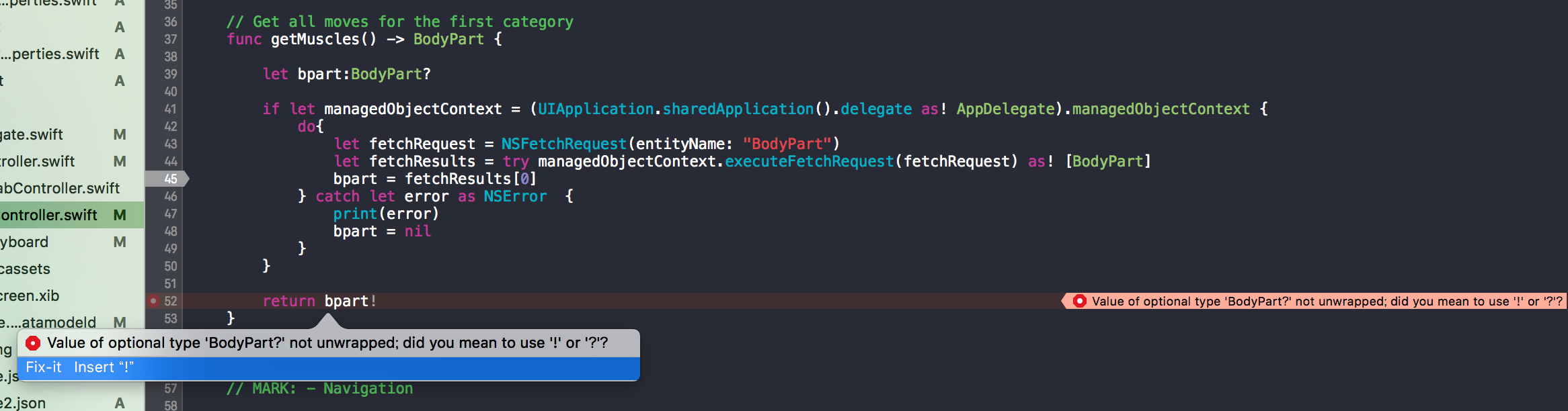 在特定的上下文中,因为要从CoreData中获取对象,所以允许getMuscles()返回零可能是明智的。