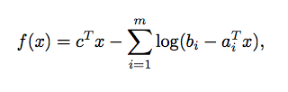 fx = c.transpose()*x - cvxpy.sum_entries(cvxpy.log((b - A.transpose()* x)))