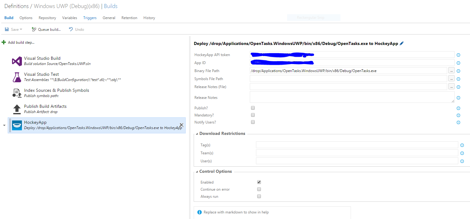 Total files copied: 299.在我的VSTS构建定义中,我添加了HockeyApp任务,并使用HockeyApp API令牌和来自HockeyApp的AppId对其进行了配置。