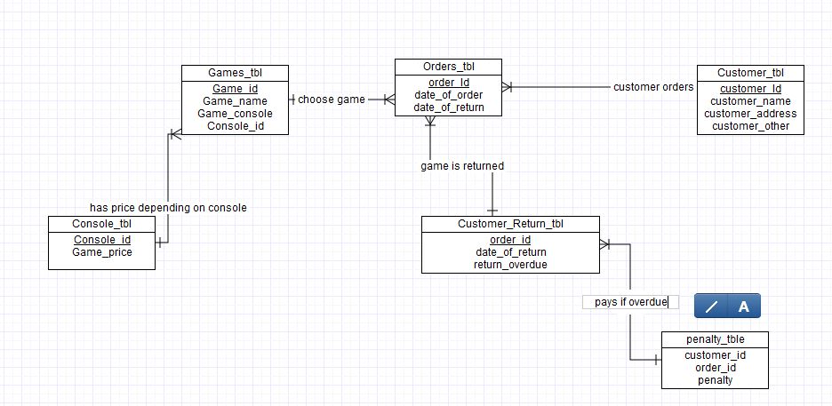 我是新的论坛和sql,我已经尝试寻找一个答案,但我无法找到具体的我需要什么。交易是这样的。对于拼贴项目,我必须做一个游戏租赁网络应用程序。我想出了一个主意,它应该做什么,为此,我创建了我的ER模型。但我不确定它是否好。问题是不要做非常复杂的应用。