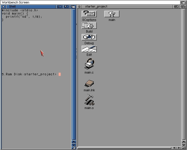 printf("%d", 1/0);确实推荐使用AmigaOS Alert()函数。在调试阶段,我在阿萨诺2上广泛使用了它。
