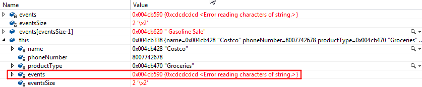 this->events[eventsSize-1] = new char[strlen(event) + 1]; //cstring array第一行是内存泄漏。您每次都在重新定义事件指向的位置。