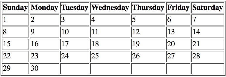 下面是一个更简洁的重构,通过嵌套一个条件else消除了上述初始解决方案中的冗余--如果语句在for -循环中检查可分性(当我被除以7时返回0),通过关闭行有效地创建一个新的表行,当周的天数除以7并返回剩余的0;否则,或者else,循环将继续在一周的一天内增加表行单元格,直到受到for -循环定义i <= 30中指定的整数约束(30)的限制。