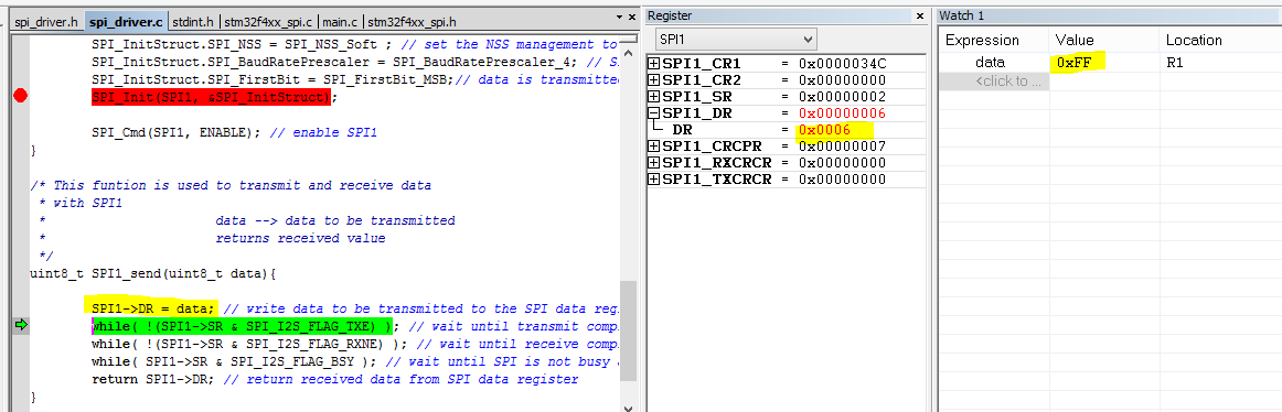 SPI1->DR = data; // write data to be transmitted to the SPI data register