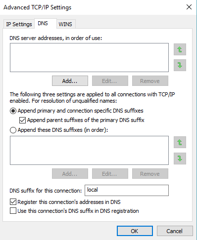 此外,在“高级”-window中的网络适配器设置中,在“DNS”-tab下,必须将“本地”-suffix注册为连接DNS地址的DNS后缀。