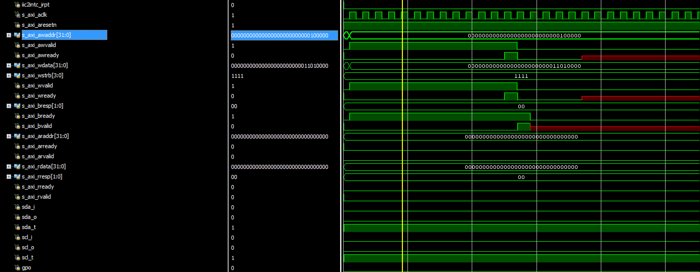 我试图编程一个IIC主接收器的重复启动。将设备地址写入TX_FIFO s_axi_bvalid之后,s_axi_wready和s_axi_awready是'X‘。我不确定发生了什么。我已经附上了我的计时图。谢谢你的帮助。