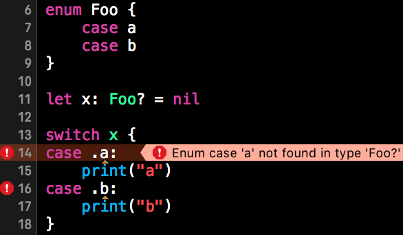 }但这可能并不一定特别有用。我们有一个可选的枚举,最后,如果我们在一个开关中处理我们的可选项,我们只会有嵌套的switch语句。相反,我们应该以正常的快速处理选项的方式来处理我们的选择: