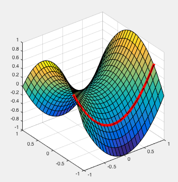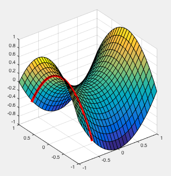 表面上的黑线由与x、y和z坐标相对应的三个矢量描述。例如,如果您希望提取与x=x(5)=-0.6667对应的直线,则需要提取已经包含在meshgrid和Z-数组- X(5,:),Y(5,:),Z(5,:)中的三个向量。