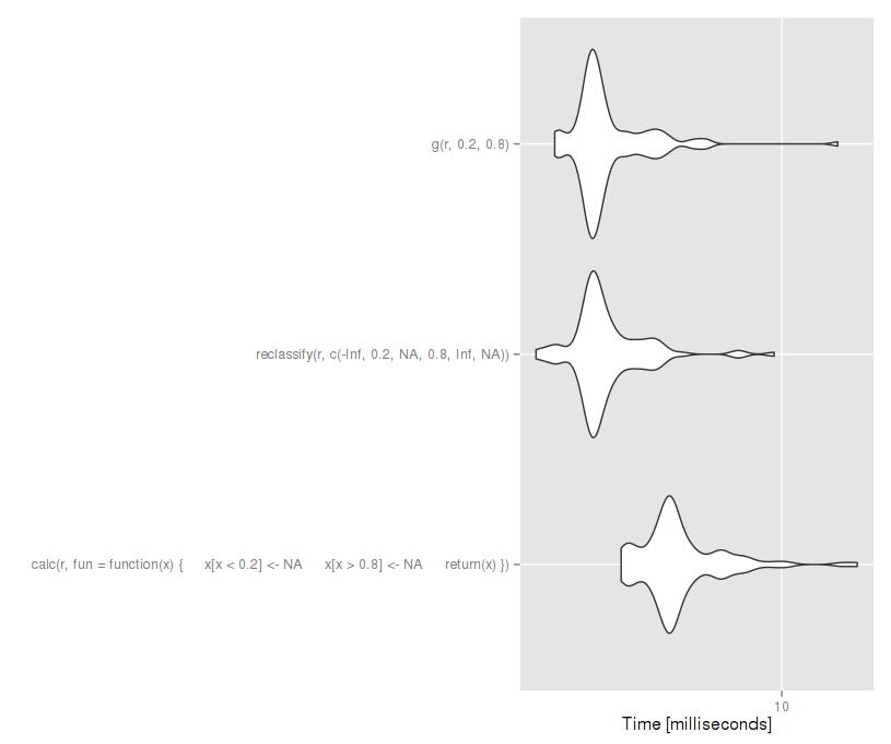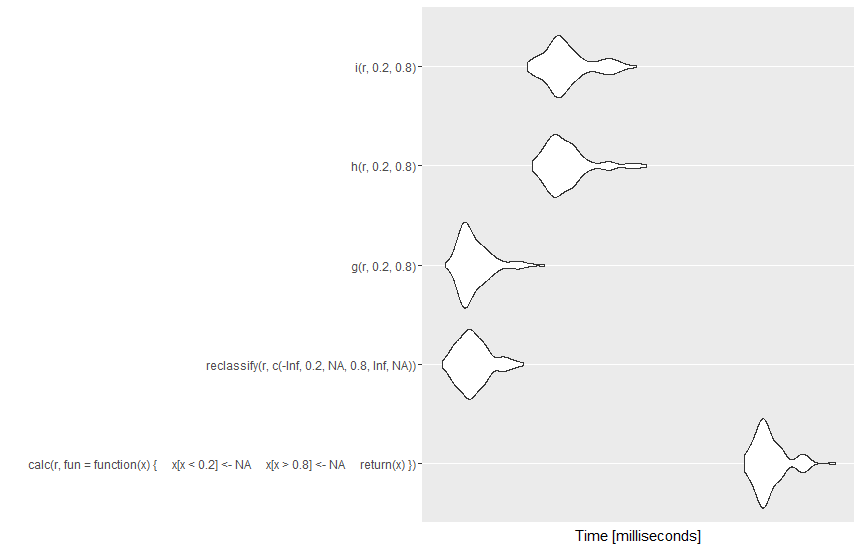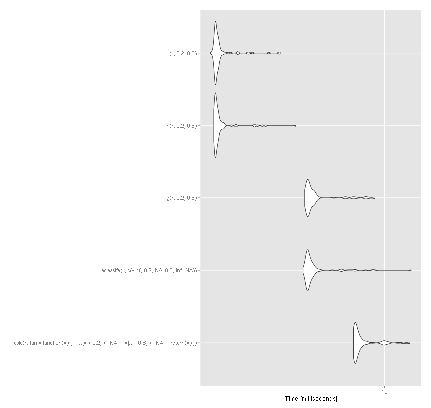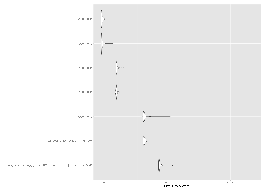 虽然对这个问题的公认答案对于光栅来说是正确的,但重要的是要注意,最快的安全函数高度依赖光栅大小:@rengis提供的函数h和i只有相对较小的栅格(和相对简单的重分类)才更快。在OP的示例中,只需将光栅r的大小增加10级,就可以使reclassify更快: