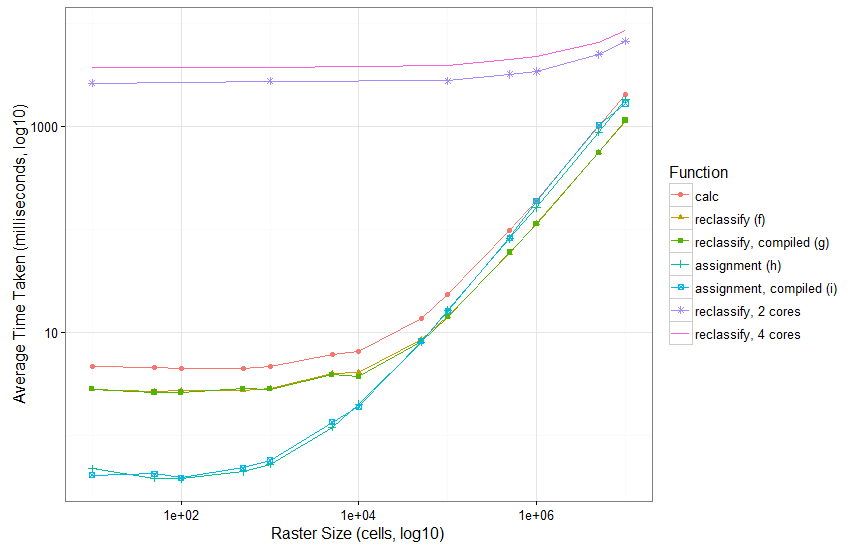 }, finally = endCluster())多线程涉及到更多的设置开销,因此只有在非常大的栅格和/或更复杂的计算中才有意义(事实上,我惊讶地注意到,在我下面测试过的任何条件下,它都不是最好的选择--也许是进行更复杂的重新分类?)
