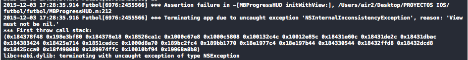 在-MBProgressHUD initWithView中的断言失败:-终止应用程序由于非正常的异常'NSInternalInconsistencyException',原因:‘视图不能是nil.’‘。
