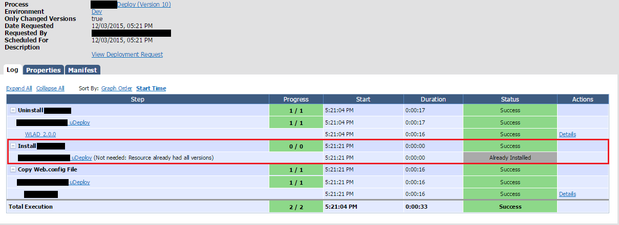 但是,当部署过程进展到安装阶段时,什么都不会发生--安装过程在进入并成功执行web.config复制进程之前没有执行,显示了“已安装”状态,尽管前面已经成功地完成了卸载过程(请参阅下面)。