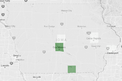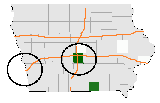 那么,在地图上包含道路和绘图圈有一个简单的解决办法吗?还是我需要放弃使用choroplethr,转而使用ggmap、ggplot2或其他什么东西?我还能在他们的网站上找到爱荷华州公路的DOT形状文件,所以这是一个可以包括的选项,但我不知道如何具体地要求它在标绘和阅读R.
