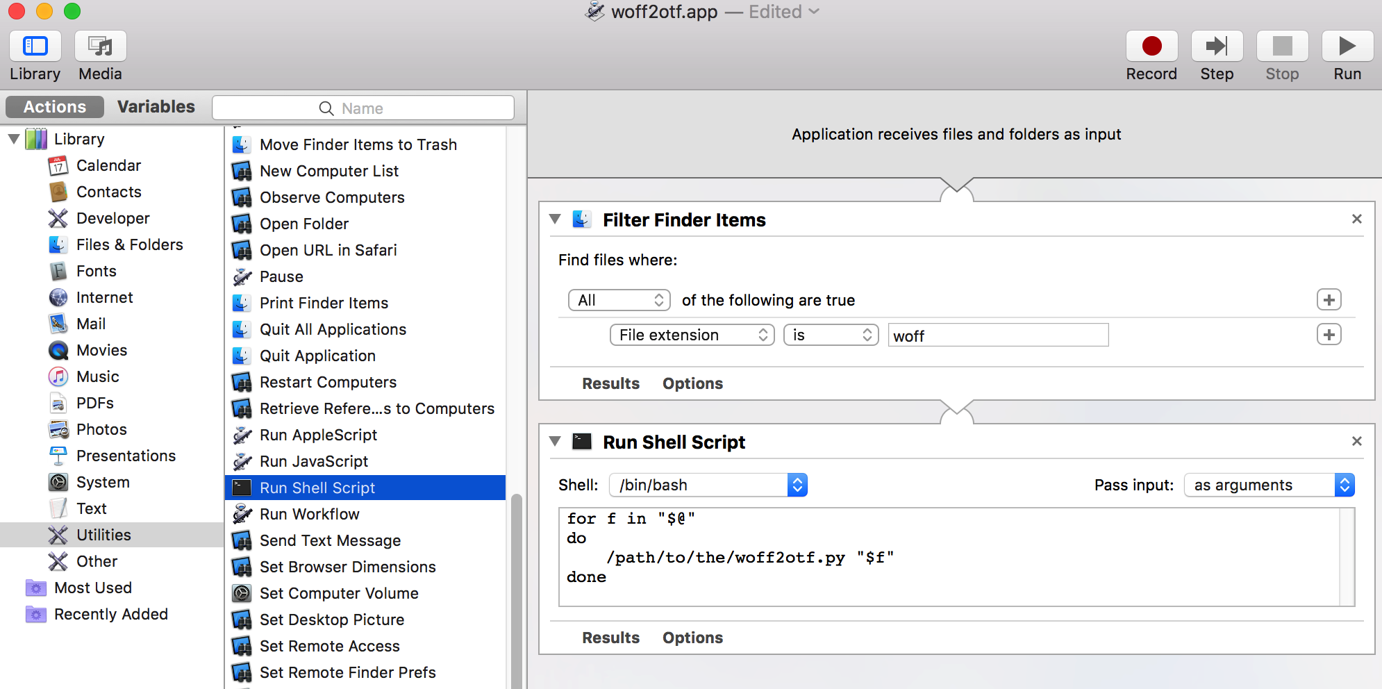 Filter Finder Items操作extenstion is woff条件Run Shell Script操作Pass input弹出更改为作为参数的woff2otf.py拖放到回显的位置(您将得到它的完整路径名称)woff2otf.app的某个位置只需将woff文件拖到应用程序图标中,它就会转换它们。我无法测试它,因为我没有安装python3。