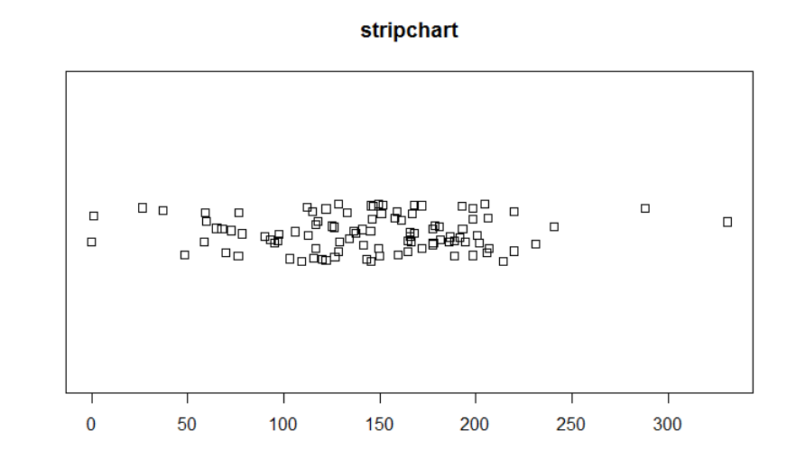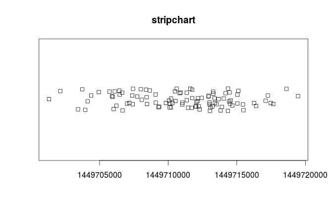 stripchart(as.numeric(time), main="stripchart", method="jitter", jitter = 2, xaxt="n")