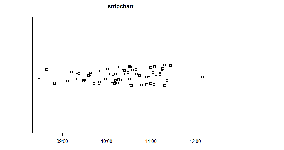 stripchart(as.numeric(minutes), main="stripchart", method="jitter", jitter = 2)它产生这个(x轴以分钟为单位):