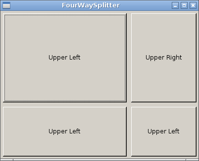 我想要做一个应用程序,其中包括四个小部件,这些小部件可以使用QSplitter进行调整。在这个应用程序中,我希望当我调整拆分器的大小时,所有四个小部件都会被调整大小。我意识到这一点,有一个水平分离器包含两个垂直分离器。然而,这种方式的垂直拆分只涉及两个小部件,而不是所有四个。这种“矩阵”分裂有什么办法吗?