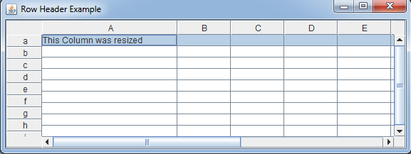 如图所示,在本表中,您可以调整A、B、.列的大小。但是不能用小写字母a,b,c,e调整列的大小.即rowHeader of JScrollPane。