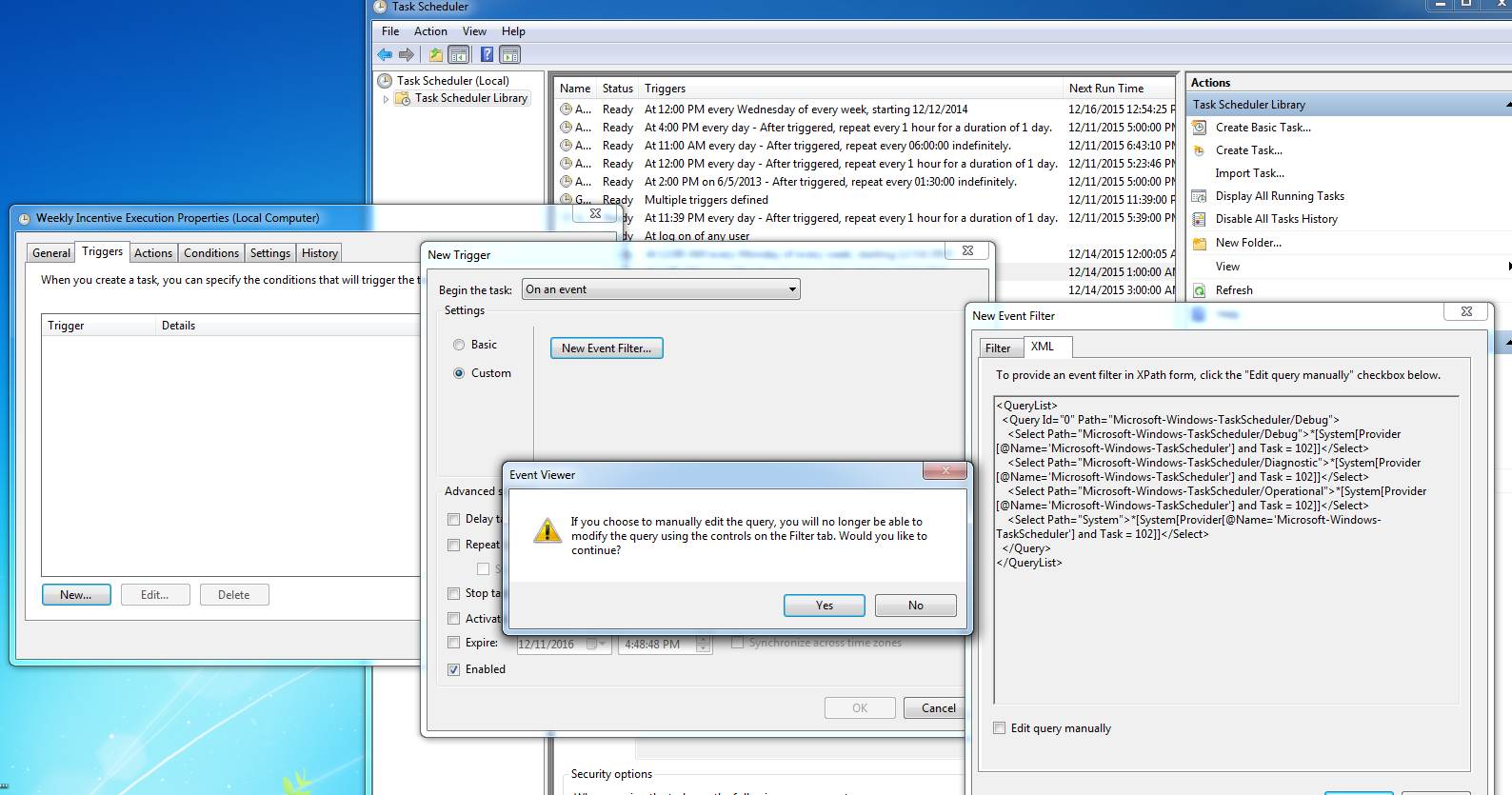 我每周使用python脚本和excel宏运行几次报告--每周运行几个小时,必须在周一凌晨后完成。任务调度器是我的完美工具!不过,我想提高效率。我想在上一次完成之后(而不是仅仅猜测一次时间)开始执行这些操作。我看到我可以开始任务‘在一个事件’和一个自定义过滤器,我可以得到真正接近我想要的……你们中的一个巫师能帮我吗?我敢打赌,当任务XYZ = ###时,我需要编辑XML代码,但我只是不知道XML :(