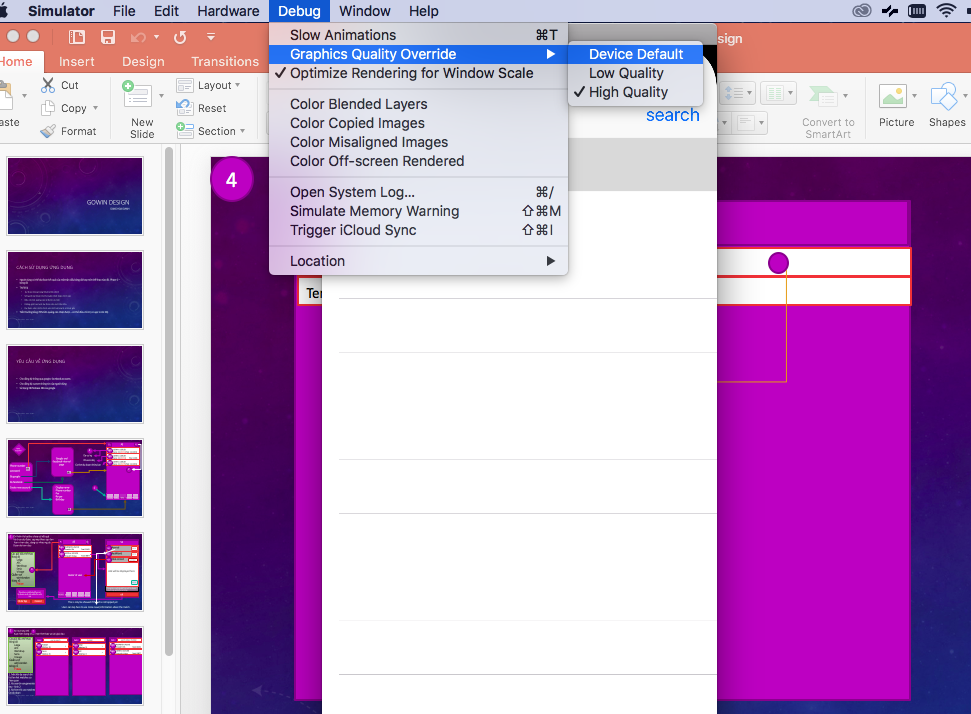 如果您迫切希望它消失,打开您的Mac上的模拟器,转到调试菜单,然后选择图形质量覆盖>设备默认。您现在可能已经将其设置为高质量,这就是警告信息告诉您的内容。