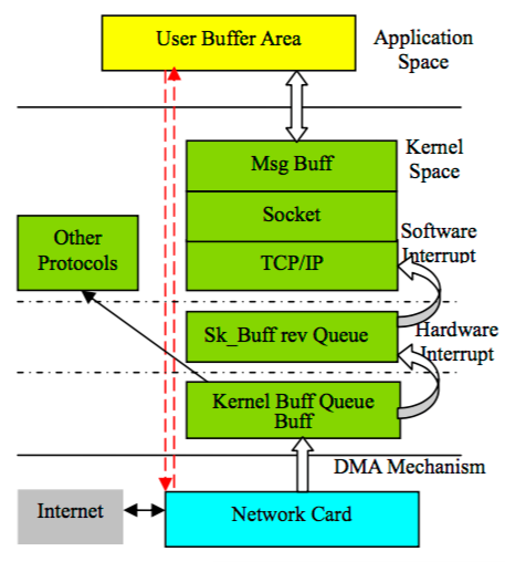 在传统模型中,应用层要获取消息数据,需要经过两个缓冲区和正常的TCP/IP协议栈。在内部,软件中断负责从接收队列的第一个接收消息,然后将它们复制到MSGBuff;应用层通过系统调用将消息数据读取到用户应用程序空间。