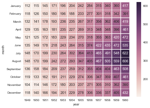 sns.heatmap(flights, annot=True, linewidths=.2, fmt="d")