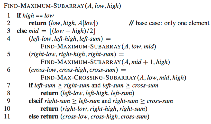 我需要一些提示来实现这个算法在C。这是一个最大子阵问题。我编制了多项式时间程序和线性时间程序。我对C很陌生,所以我不知道如何根据这个算法的要求从一个函数返回多个值。例如,算法(左-低,左-高,左-和)=查找-最大值-SUBARRAY(A,low,mid)中的这一行,其中FIND-MAX-SUBARRAY(A,low,mid)是一个递归函数调用。