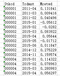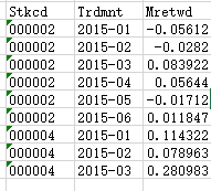 Stkcd是股票id,Trdmnt是记录时间,Mretwd是该股票数量的增加。我有一个股票excel表,如上图所示,我想分析每个季度(2015-1 2015-2 2015-3 is one quater)的数据,如果Trdmnt数据不是一个完整的四元数据,我将删除不完整的行。例如: