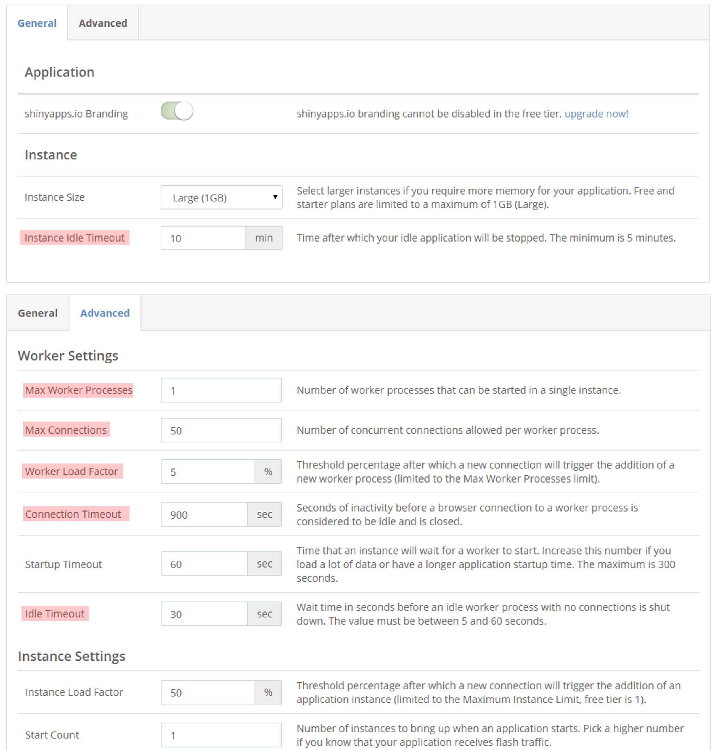 调谐参数 上面描述的体系结构使用两个负载因素来微调应用程序的性能。 工作负载系数-新浏览器连接将触发添加新工作人员的阈值百分比。 实例加载因子-新连接将触发添加新应用程序实例的阈值百分比(限制为最大实例限制,空闲层为1) 每个负载因子都基于阈值百分比的概念,即在shinyapps.io启动另一个工作人员或应用程序实例之前允许打开的可用连接或进程的百分比。两个设置都可在给定应用程序的“设置”页内的“高级”选项卡中进行配置。
