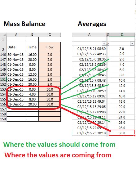 我试着根据它们在时间上的紧密程度,在不同的时间里把它们联系起来。在两个不同的表(“质量平衡”和“平均值”)中有一个时间列,我想复制数字从“平均数”粘贴到“质量平衡”,根据这些数字的时间是多么接近(见图)。