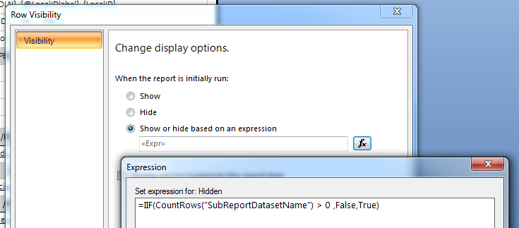 =IIF(CountRows("SubReportDatasetName") > 0 ,False,True)