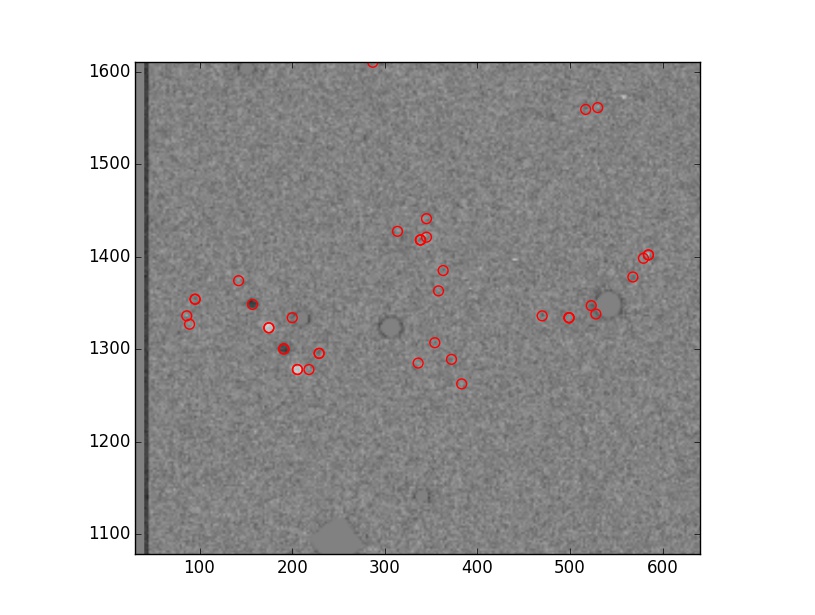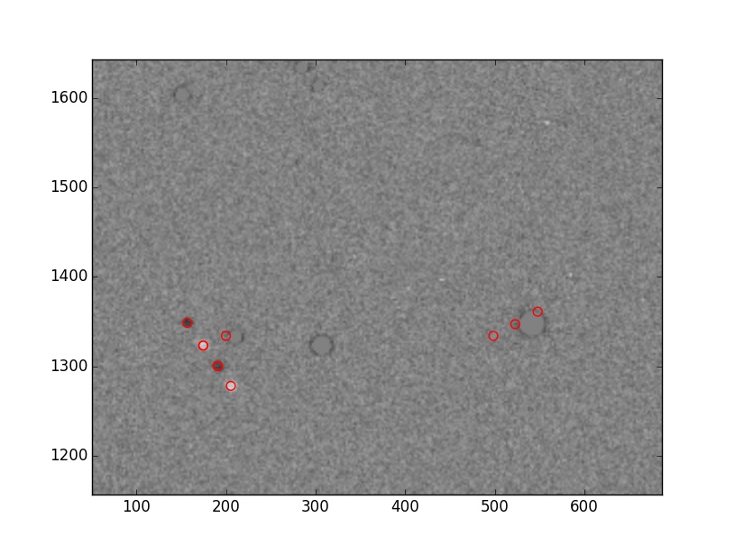 这是一张图片来展示我想要的东西。这幅图像显示的是由这些功能发现的微弱的移动小行星,所有的噪音也被发现。你可以看到小行星的3+点大致在同一条线上,而噪音却是随机的。我试着放弃在同一条线上只有两点的观点。