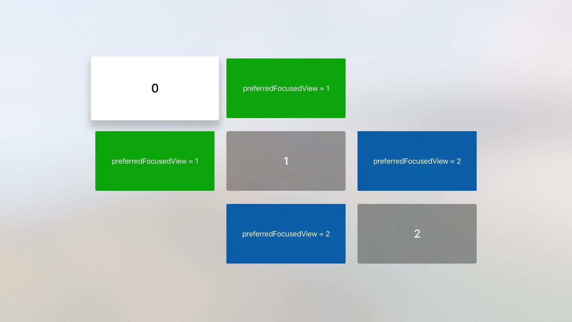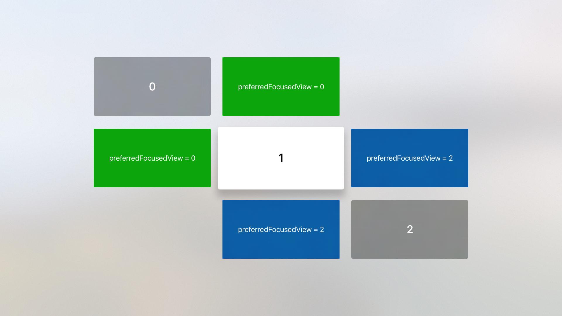 当焦点发生变化时,您将更新焦点指南,以引导焦点返回方向。例如,一旦按钮0获得焦点,您将更新绿色焦点指南的preferredFocusedView,使其更喜欢按钮1,这样用户就可以从焦点按钮0向下移动或从焦点按钮0直接移到按钮1处。